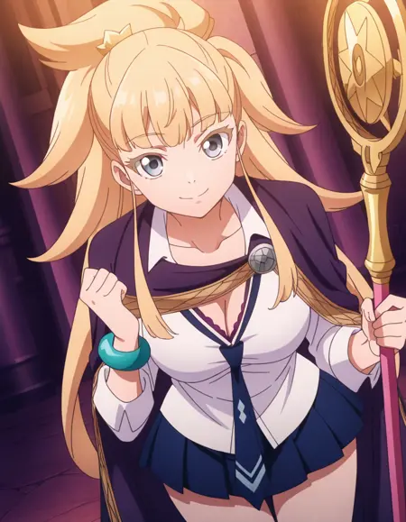 Her outfits perfectly balance her dual nature as princess and warrior. She typically wears a modified school-style uniform—a white blouse with a loosely tied necktie and a short navy skirt with lace trim—combined with a regal purple cape that billows dramatically behind her. This fusion of modern school aesthetic with fantasy royalty creates a unique visual signature. A golden hair ornament shaped like a flame or crown adorns her ponytail, marking her status. Fans immediately recognize her not just by her beauty, but by the confident, almost commanding way she presents herself—she looks like someone born to rule, yet accessible enough to fall in love with.